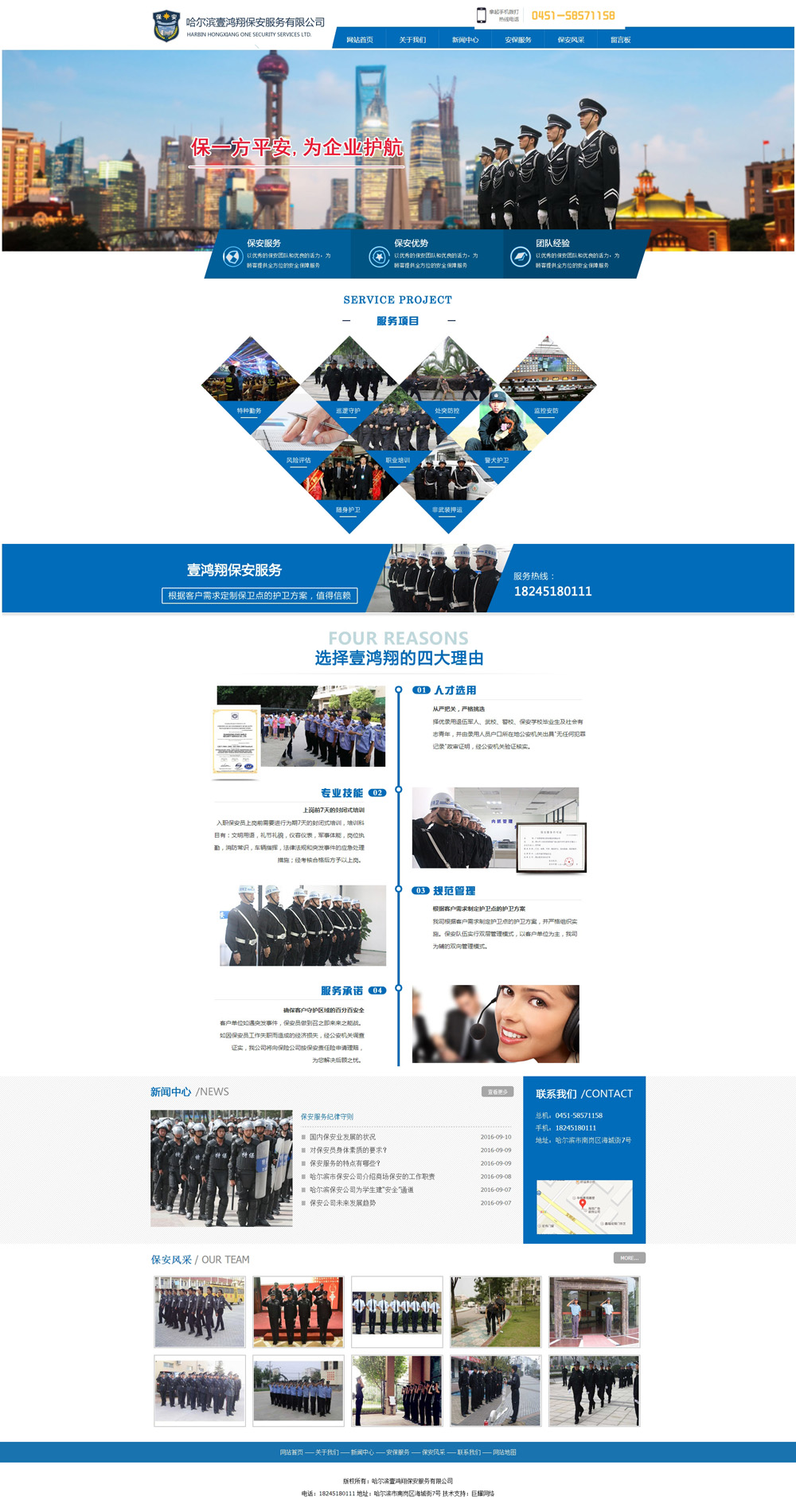 公司立足于冰城哈爾濱,成功并長期合作的為各行各業提供專業性安保服務,例哈爾濱國際機場,雙城花園酒業,超龍美容院,桃李食品,平方蘇寧物流基地,齊齊哈爾蘇寧、佳木斯蘇寧等多個點位。 團隊成員均受系統訓練, 延續著軍人的優良作風,公司本著全面專業的服務能力,為客戶提供安逸的工作、生產環境,讓客戶滿意放心是本公司的宗旨,公司從事企業、娛樂、機關、商業、高檔住宅、大型活動等的安全保衛工作,公司不斷提高現代化的安保技能,以高素質的團隊來保障企事業單位的安全和秩序。